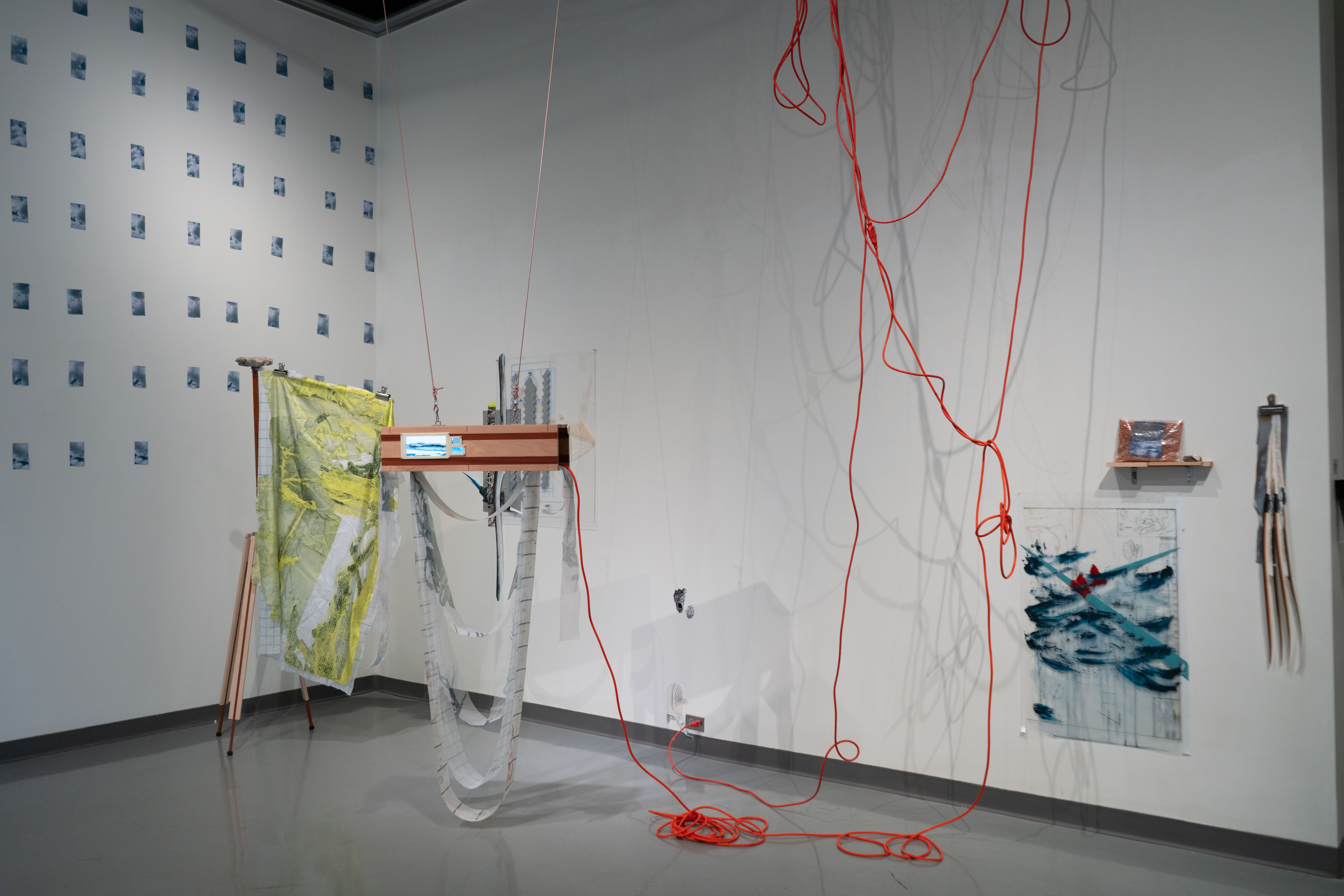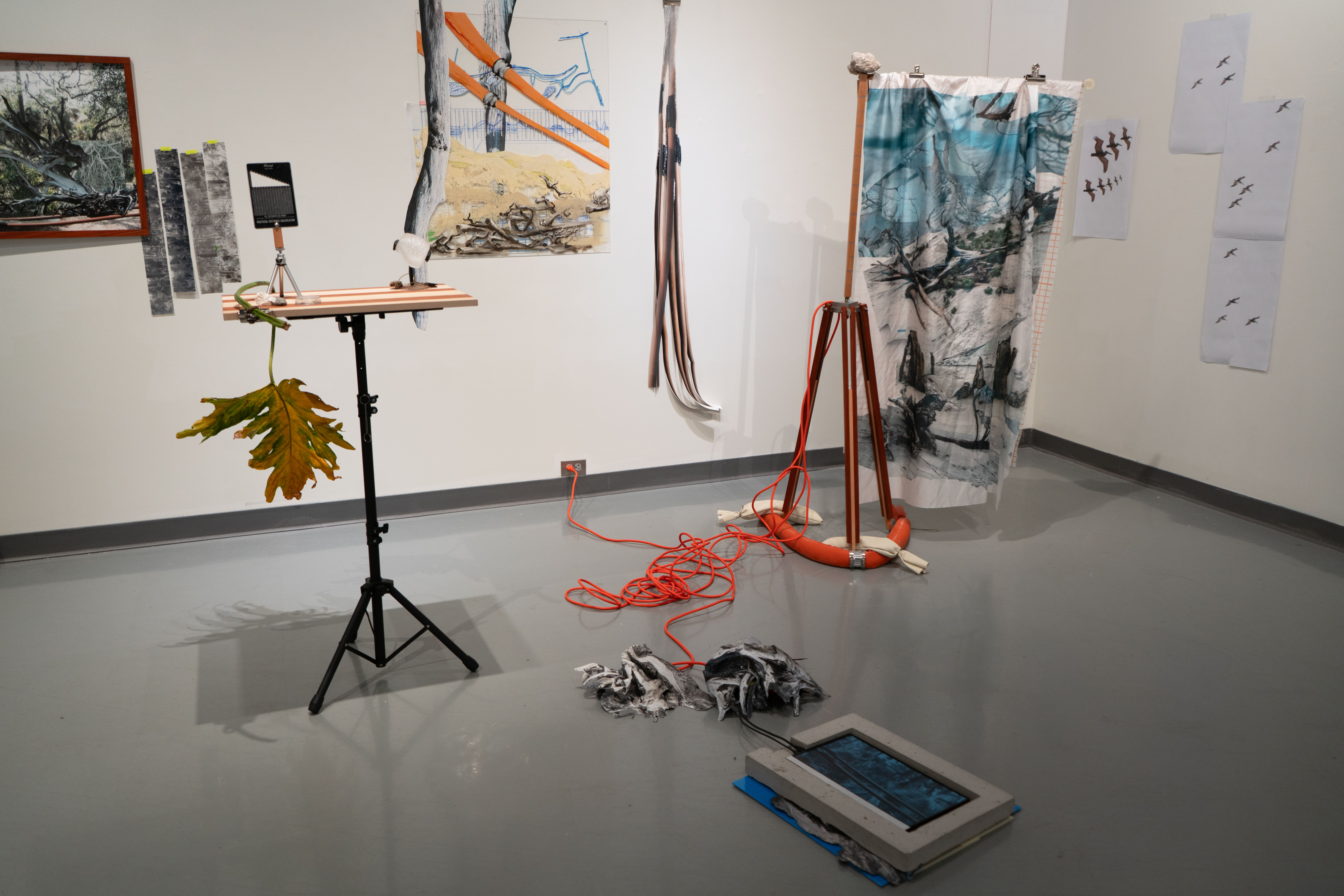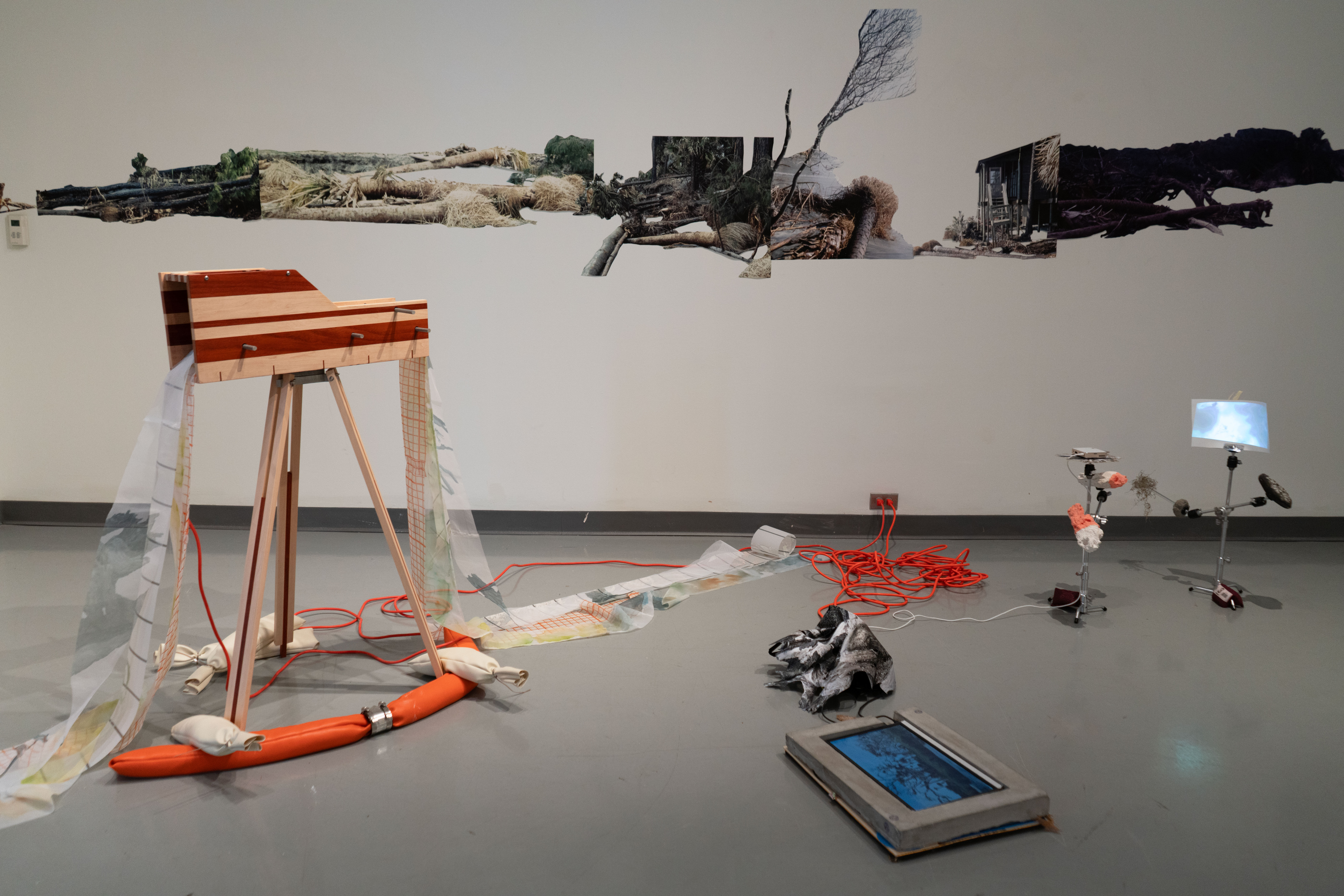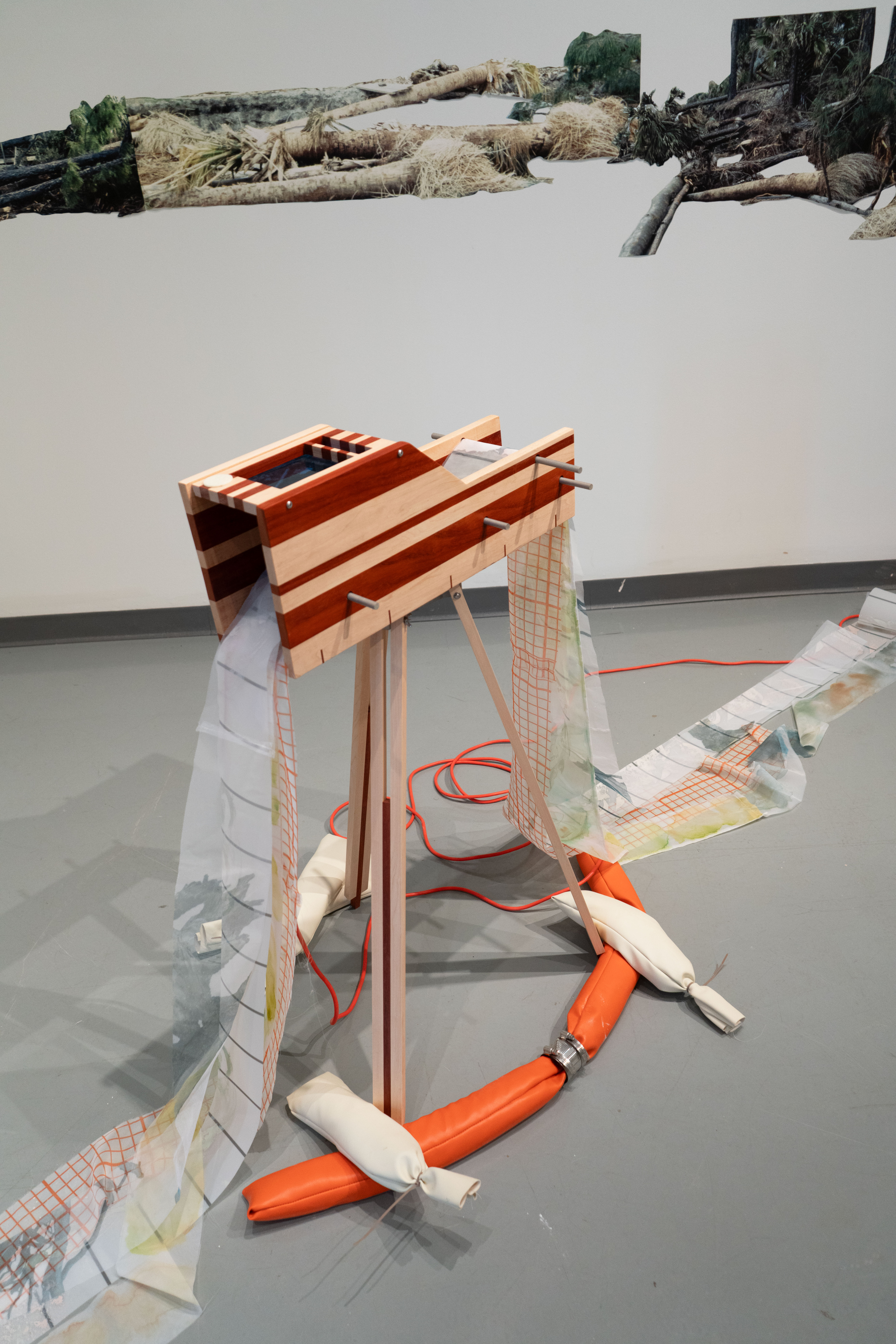 Extension cords, wood, time-lapse photos of the sky, photographs, vintage wallpaper, found objects, plaster casts, resin casts, drawings on vellum, screenprints, laser cut trees, Hunting Island blueprints, sand bags, tripods, paper rocks, reflective mylar heart blankets, found fishing nets, Spanish moss, clay collected from the ocean floor, audio, video, vs display screens, projectors, concrete, rocks collected at Hunting Island, palm fronds, reflective glass beads, tape, diving weights, dye sublimation prints, rubber, field notes, journal entires, lasercut surveyor chain, brick collected at Hunting Island, plumb line, tree bark, graph paper, digital prints of Hunting Island coastline over time, watercolor, acrylic paint, maps of Hunting Island, c-stands, bespoke cart, surveyor tripods, survey whiskers, sand, found plastic bags, oil paint, poster stands, binder clips, nautical distance calculator, seaweed, string, climbing rope, carabiners, wooden file boxes, bespoke continuous plankton recorders, bungee cords, hose clamps, Petri dish, test tubes, shelves, marine vinyl, zip ties, bespoke clipboards, wood dust