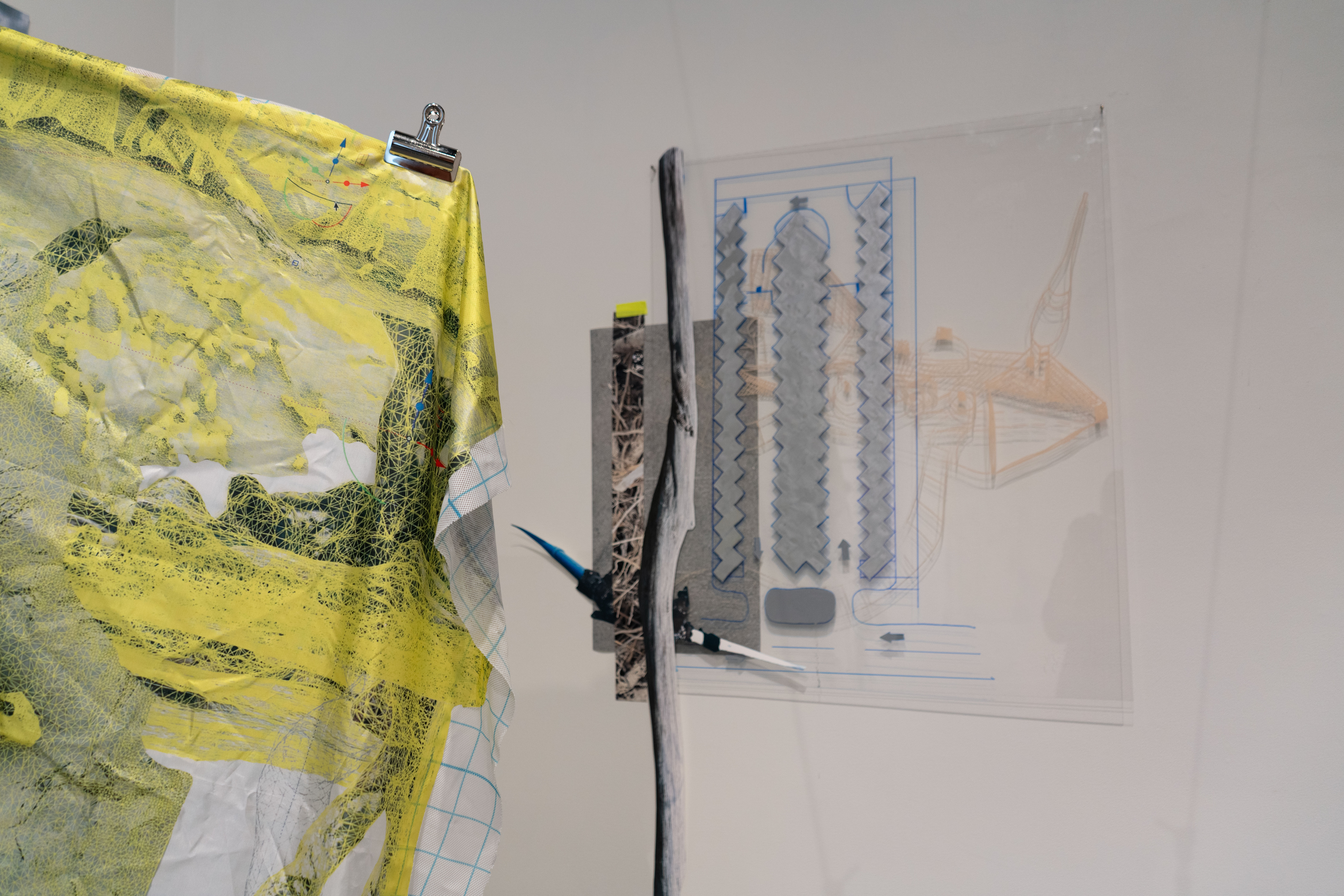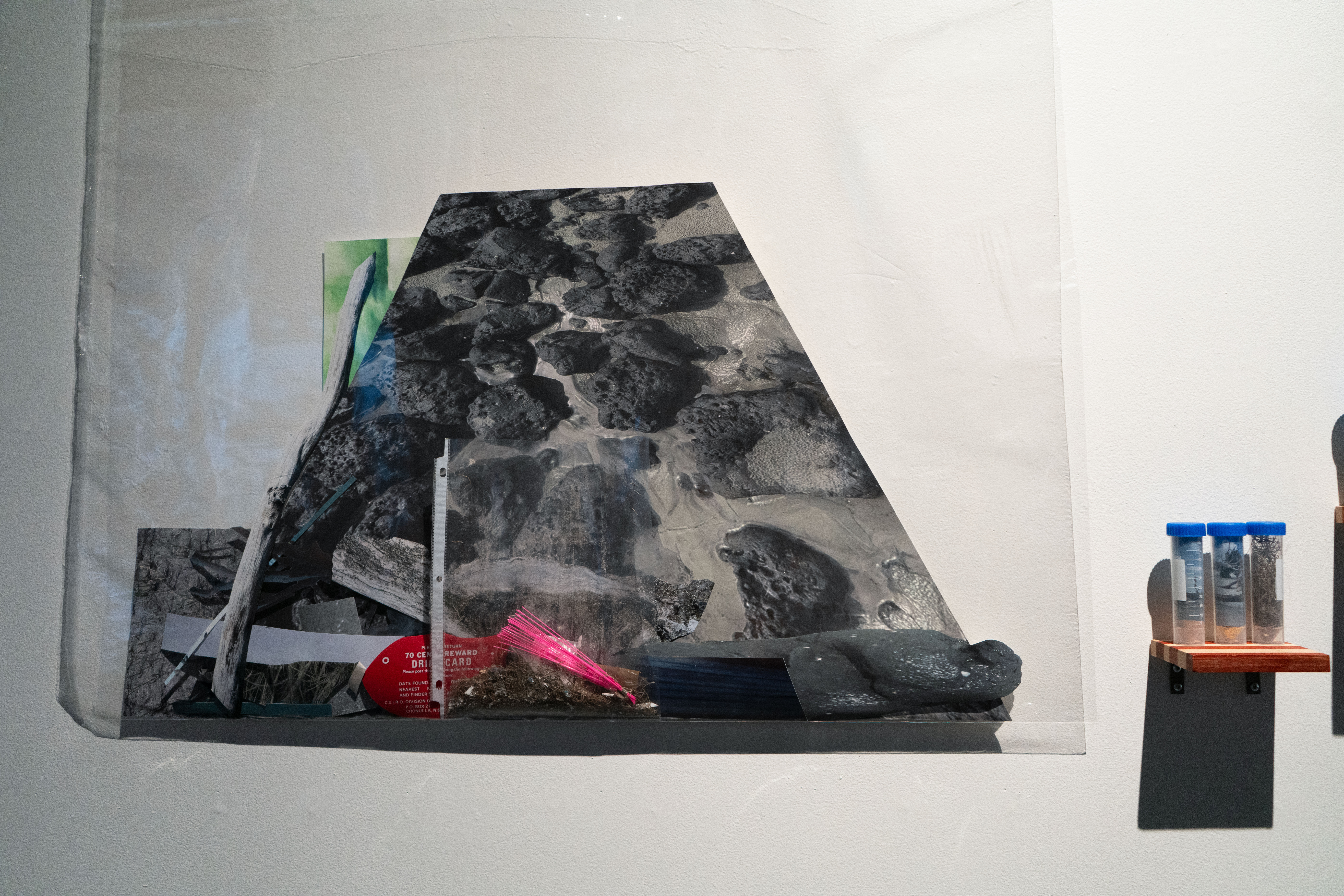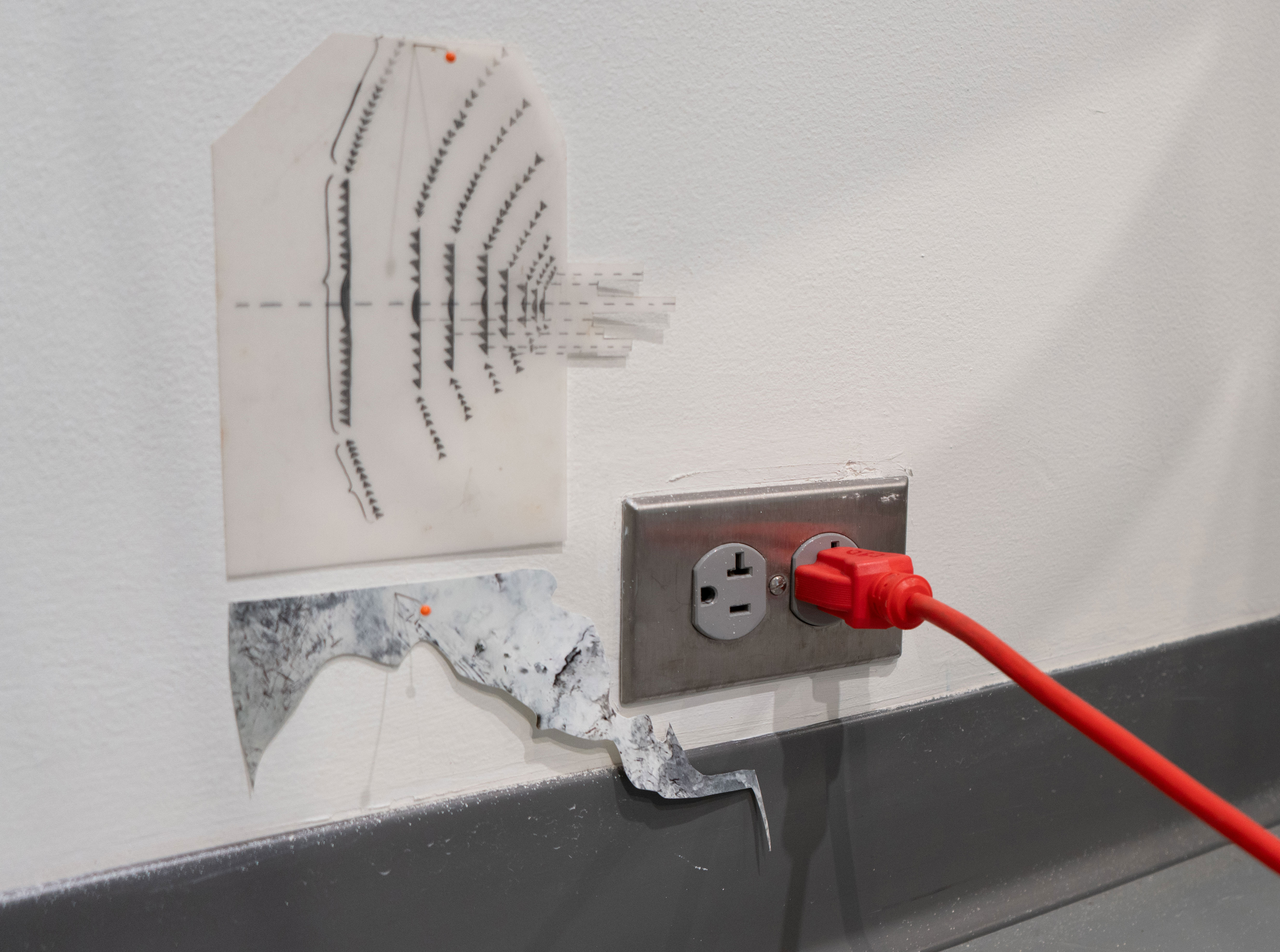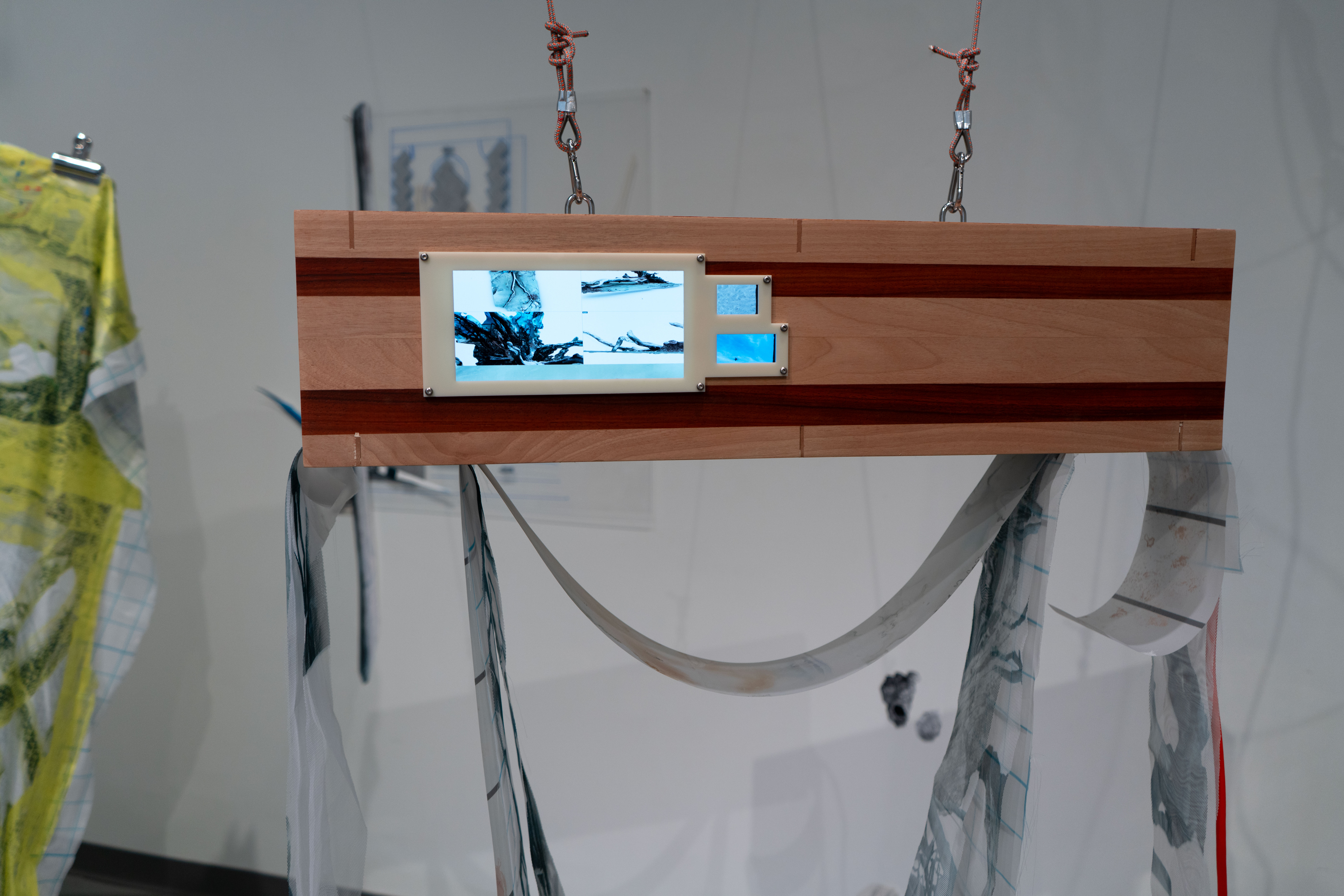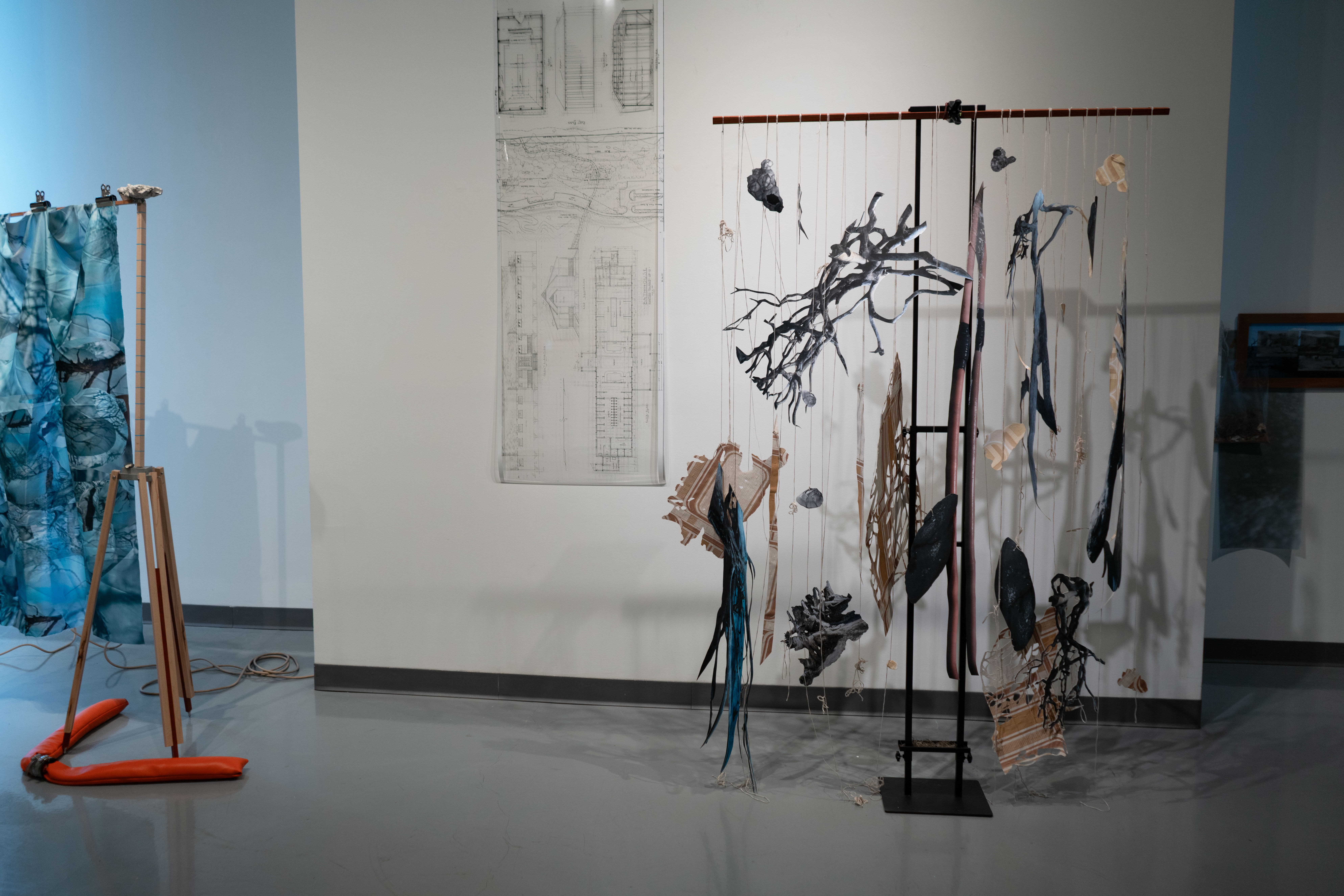 Extension cords, wood, time-lapse photos of the sky, photographs, vintage wallpaper, found objects, plaster casts, resin casts, drawings on vellum, screenprints, laser cut trees, Hunting Island blueprints, sand bags, tripods, paper rocks, reflective mylar heart blankets, found fishing nets, Spanish moss, clay collected from the ocean floor, audio, video, vs display screens, projectors, concrete, rocks collected at Hunting Island, palm fronds, reflective glass beads, tape, diving weights, dye sublimation prints, rubber, field notes, journal entires, lasercut surveyor chain, brick collected at Hunting Island, plumb line, tree bark, graph paper, digital prints of Hunting Island coastline over time, watercolor, acrylic paint, maps of Hunting Island, c-stands, bespoke cart, surveyor tripods, survey whiskers, sand, found plastic bags, oil paint, poster stands, binder clips, nautical distance calculator, seaweed, string, climbing rope, carabiners, wooden file boxes, bespoke continuous plankton recorders, bungee cords, hose clamps, Petri dish, test tubes, shelves, marine vinyl, zip ties, bespoke clipboards, wood dust