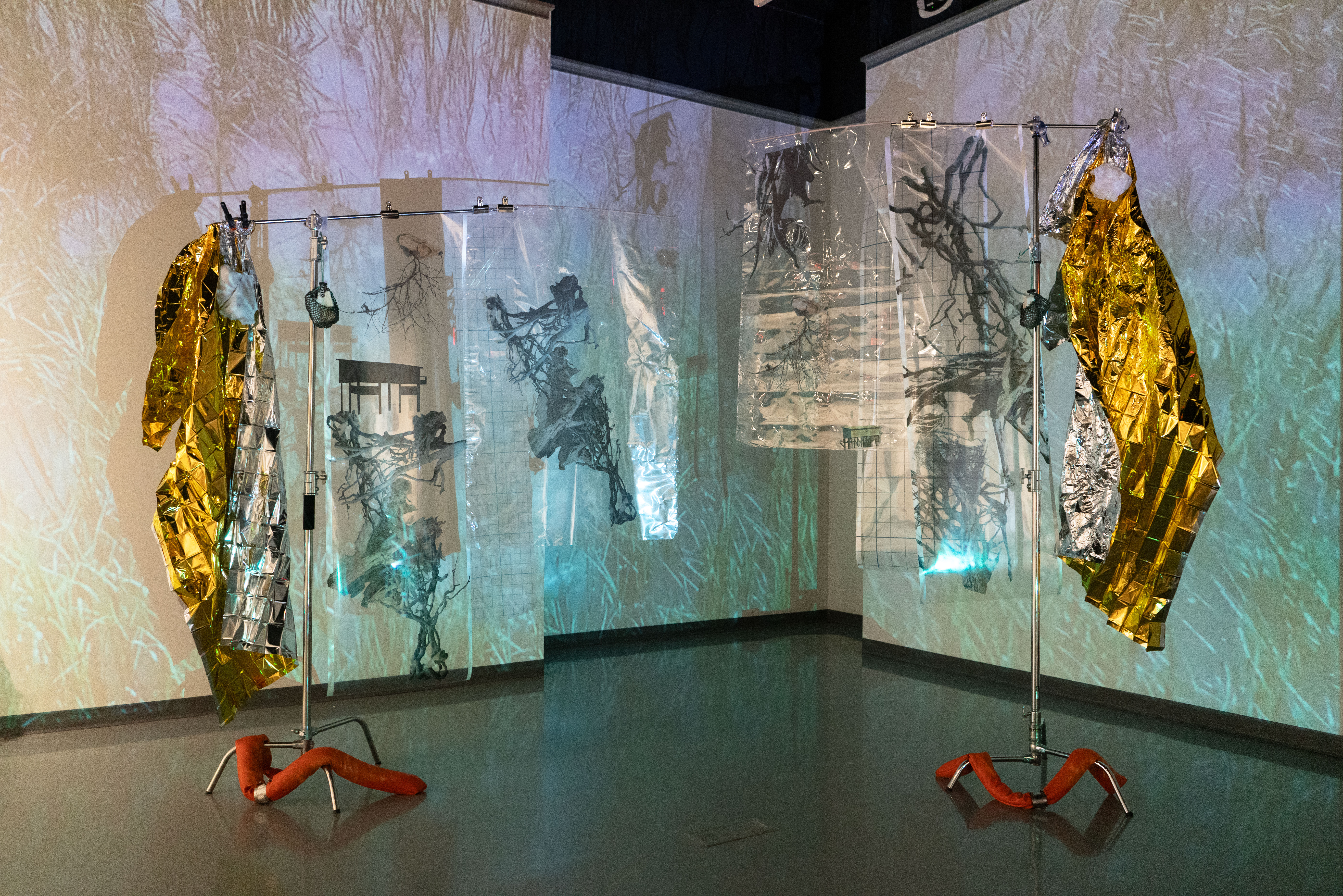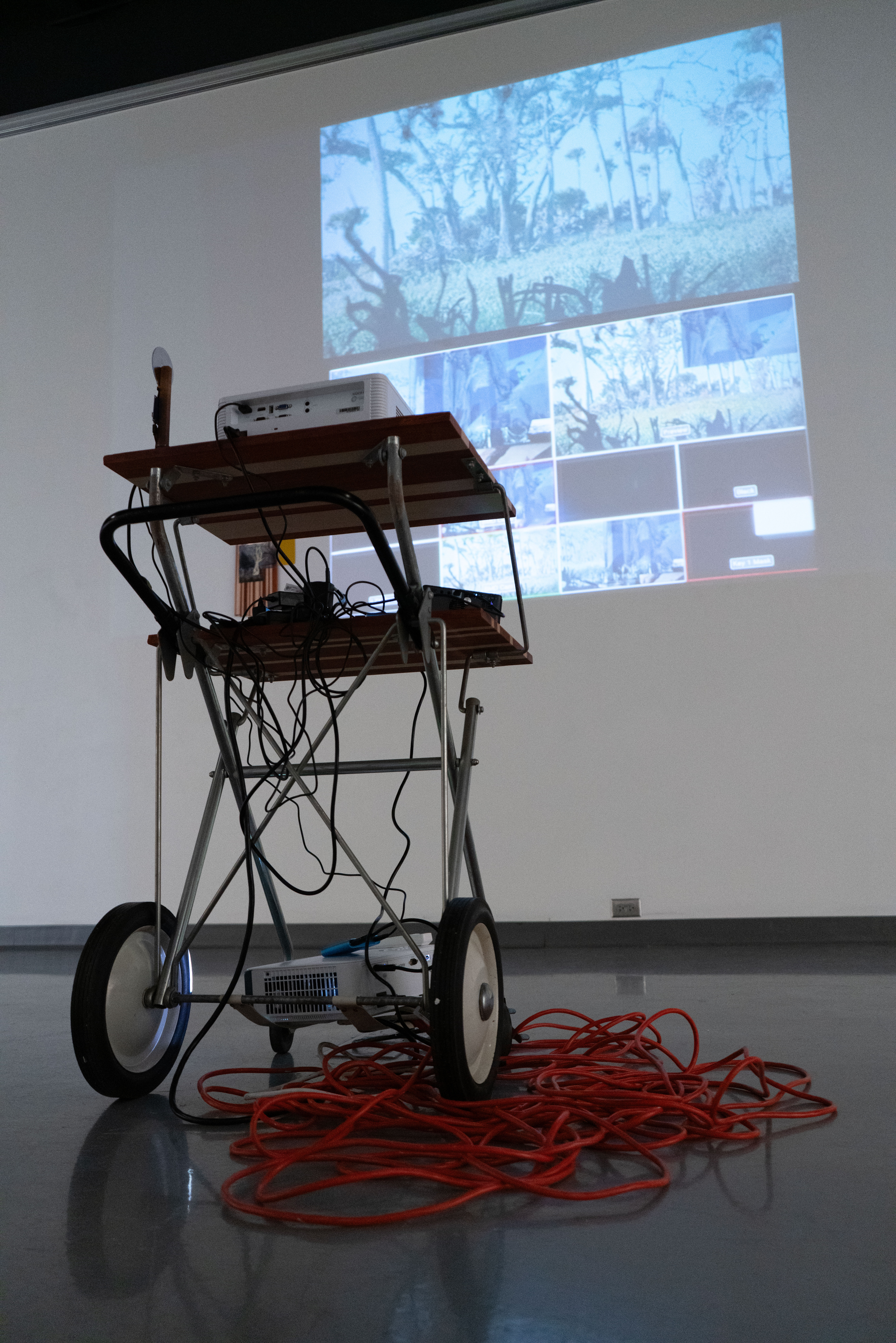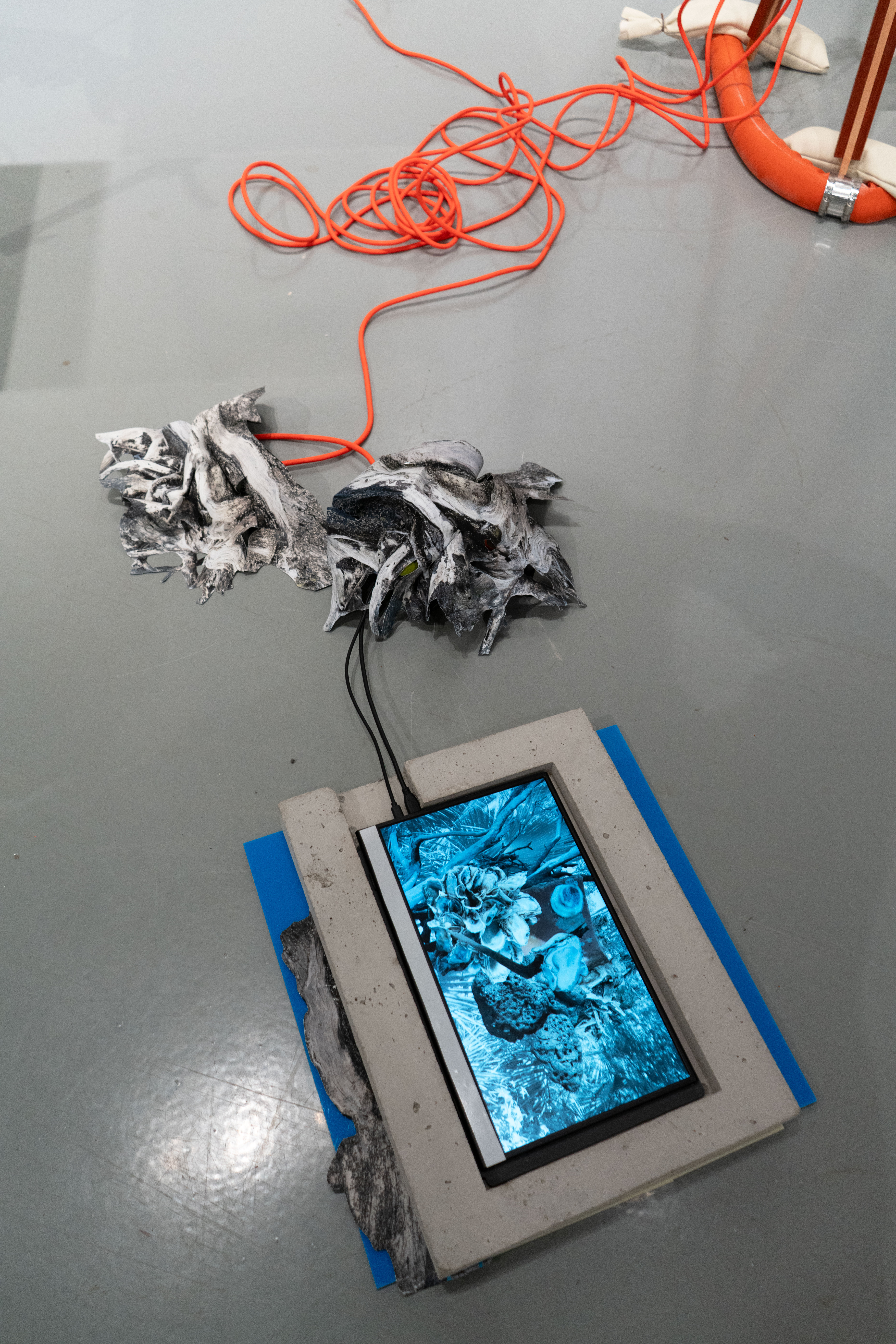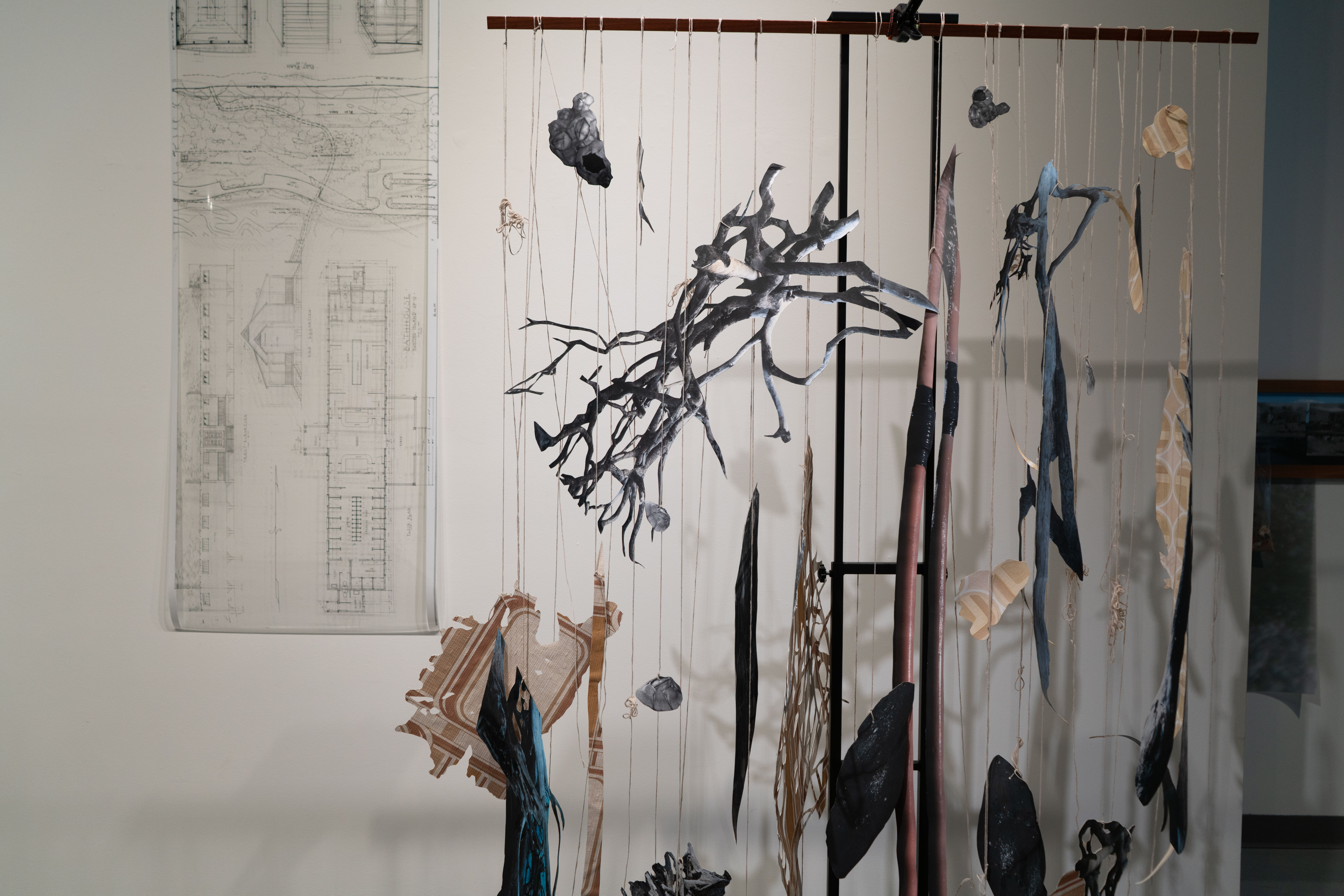 Extension cords, wood, time-lapse photos of the sky, photographs, vintage wallpaper, found objects, plaster casts, resin casts, drawings on vellum, screenprints, laser cut trees, Hunting Island blueprints, sand bags, tripods, paper rocks, reflective mylar heart blankets, found fishing nets, Spanish moss, clay collected from the ocean floor, audio, video, vs display screens, projectors, concrete, rocks collected at Hunting Island, palm fronds, reflective glass beads, tape, diving weights, dye sublimation prints, rubber, field notes, journal entires, lasercut surveyor chain, brick collected at Hunting Island, plumb line, tree bark, graph paper, digital prints of Hunting Island coastline over time, watercolor, acrylic paint, maps of Hunting Island, c-stands, bespoke cart, surveyor tripods, survey whiskers, sand, found plastic bags, oil paint, poster stands, binder clips, nautical distance calculator, seaweed, string, climbing rope, carabiners, wooden file boxes, bespoke continuous plankton recorders, bungee cords, hose clamps, Petri dish, test tubes, shelves, marine vinyl, zip ties, bespoke clipboards, wood dust