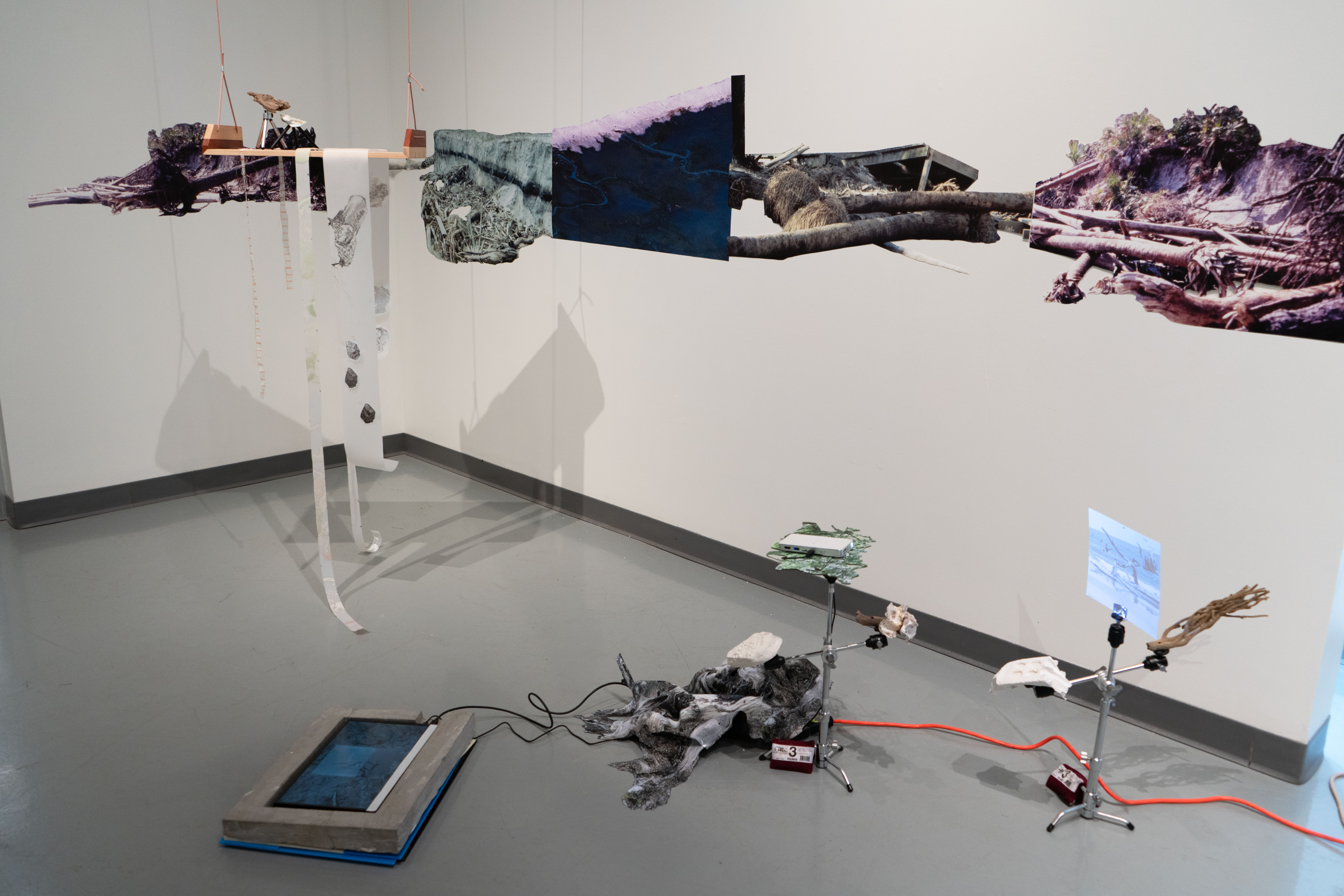 In Extremis is a multimedia installation that examines the effects of climate change and human impact on the South Carolina coastline and the ways in which the eroding salt marshes impact the surrounding landscape to create ghost forests. As marshes erode, salt water encroaches on the maritime forests, slowly killing living trees and turning them into decaying lumber. This work is the search for a transitional landscape and methods to quantify it. It is about personal and historic observations documenting a shifting landscape over time, and how all of these things combine to create a new environment that is in constant flux.